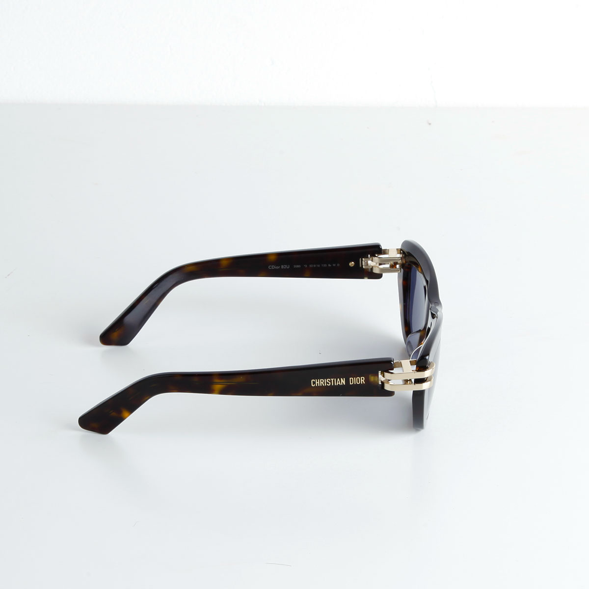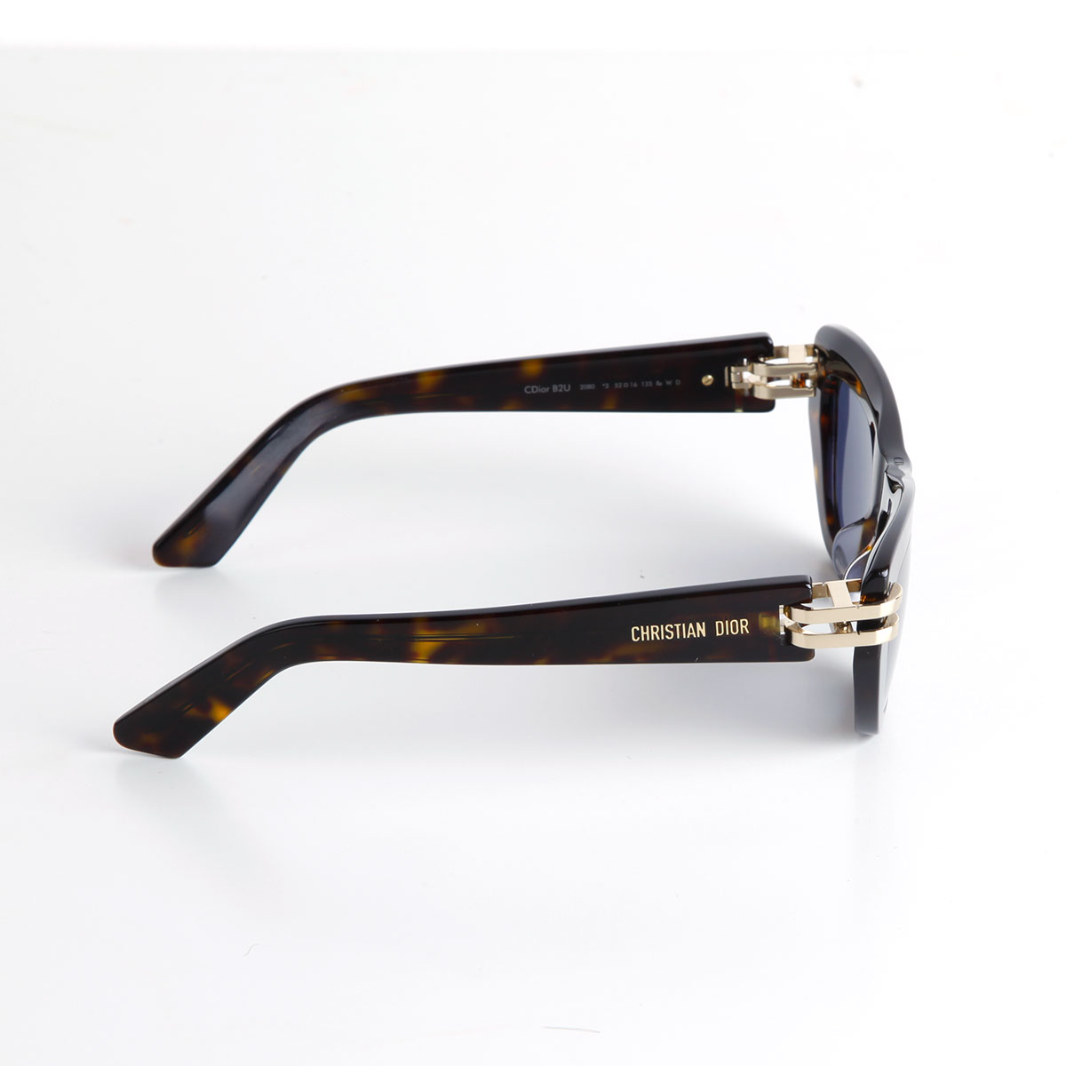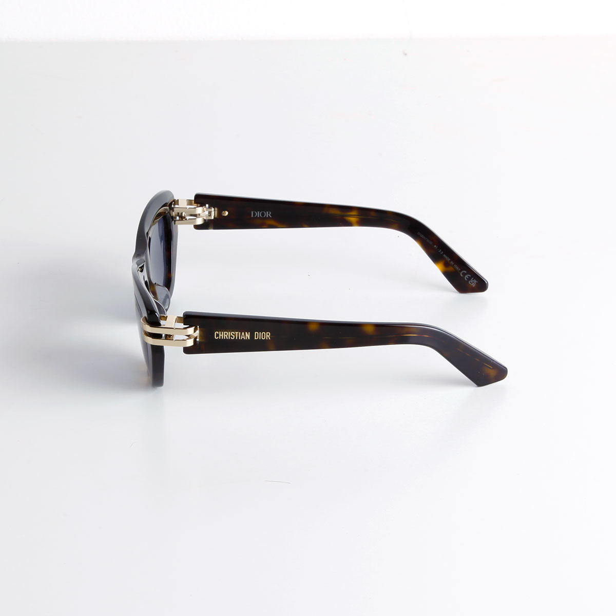 Monture papillon en acétate effet écaille, soulignée par des finitions dorées raffinées et le logo Christian Dior discret sur les branches. Verres bruns fumés offrant une protection UV optimale.
